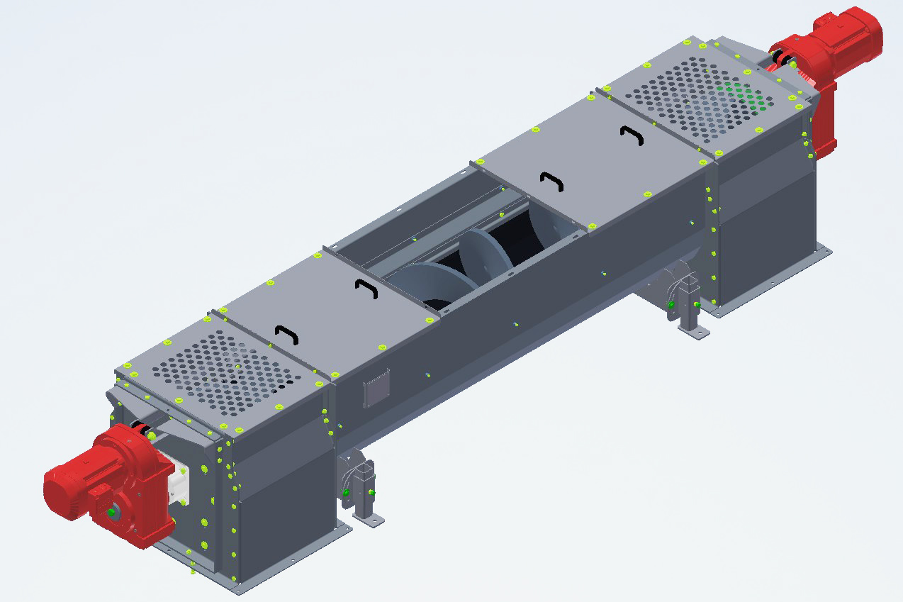 - Enclosed trough which is dust-tight, or for wet materials secures odor containment.