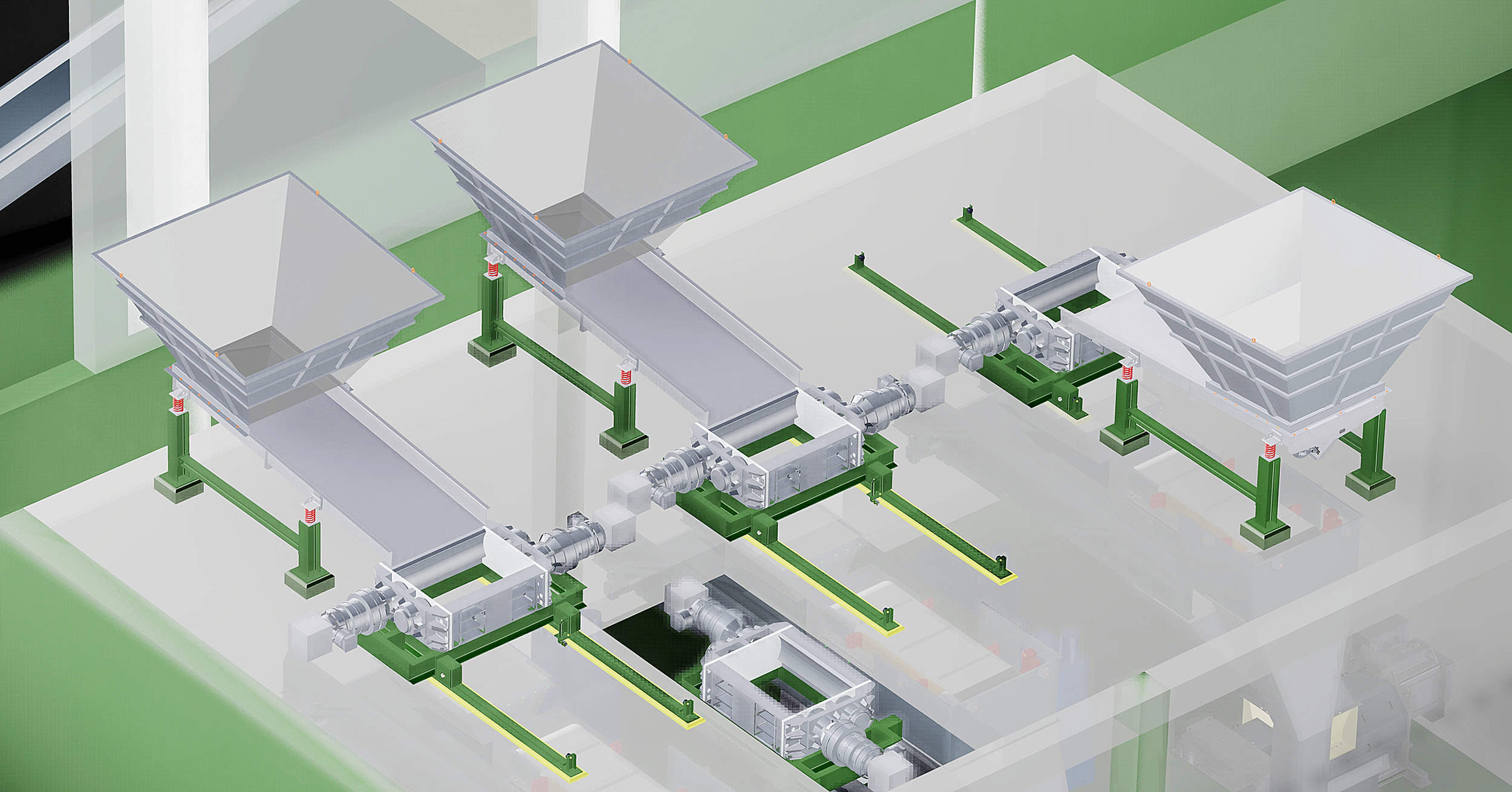 - Disaggregate bulk / dump material and generate an even, uniform material flow