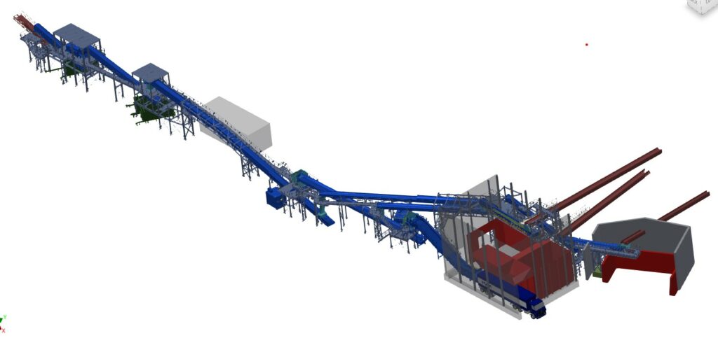 The scope included multiple equipment as Special MBC Belt Conveyors, multiple stage LION Twin Shaft Shredders, with low speed, hydraulically driven rotating knives, to cut and subsequently separate the fractions, Plastic, Fiber and Metall by the means of Fe- Magnetic and Eddy Current separation.